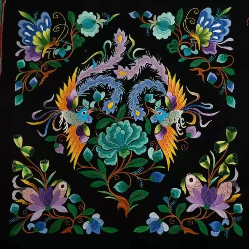 以 “双凤和鸣、繁花共生” 为核心意象,融合彝族 “凤鸟图腾” 与本土花卉元素,是彝族民间刺绣中 “吉祥合欢” 题材的经典作品。作品围绕 “和美安康、生机绵延” 的生活祈愿,将凤鸟、蝴蝶、花卉以对称灵动的方式排布,既体现彝族对祥瑞生灵的崇拜,也暗含对自然生机与生活美好的赞颂。