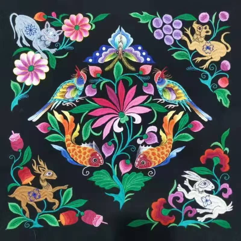 以 “自然生灵聚祥” 为核心意象,深度融合彝族传统图腾、本土自然物象与祈福符号,是彝族民间刺绣中 “生活祈愿 + 文化图腾” 双主题结合的代表性作品。作品围绕 “家宅安康、族群丰饶” 的美好期许,将彝族日常所见的动物、花卉以艺术化方式排布,既是对自然的礼赞,也是彝族文化基因的视觉表达。