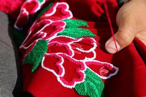 彝族刺绣:色彩浓烈奔放,常用红、黄、黑、绿等对比强烈的丝线,图案以日月星辰、山川草木、飞禽走兽为主,尤以 “火塘纹”“虎纹”“羊角纹” 最具代表性,寄托着彝族对祖先的崇拜与对丰收的祈愿。针法多采用平绣、挑绣、堆绣,绣品厚实饱满,立体感强,常见于彝族百褶裙、虎头帽、挎包等服饰配件。