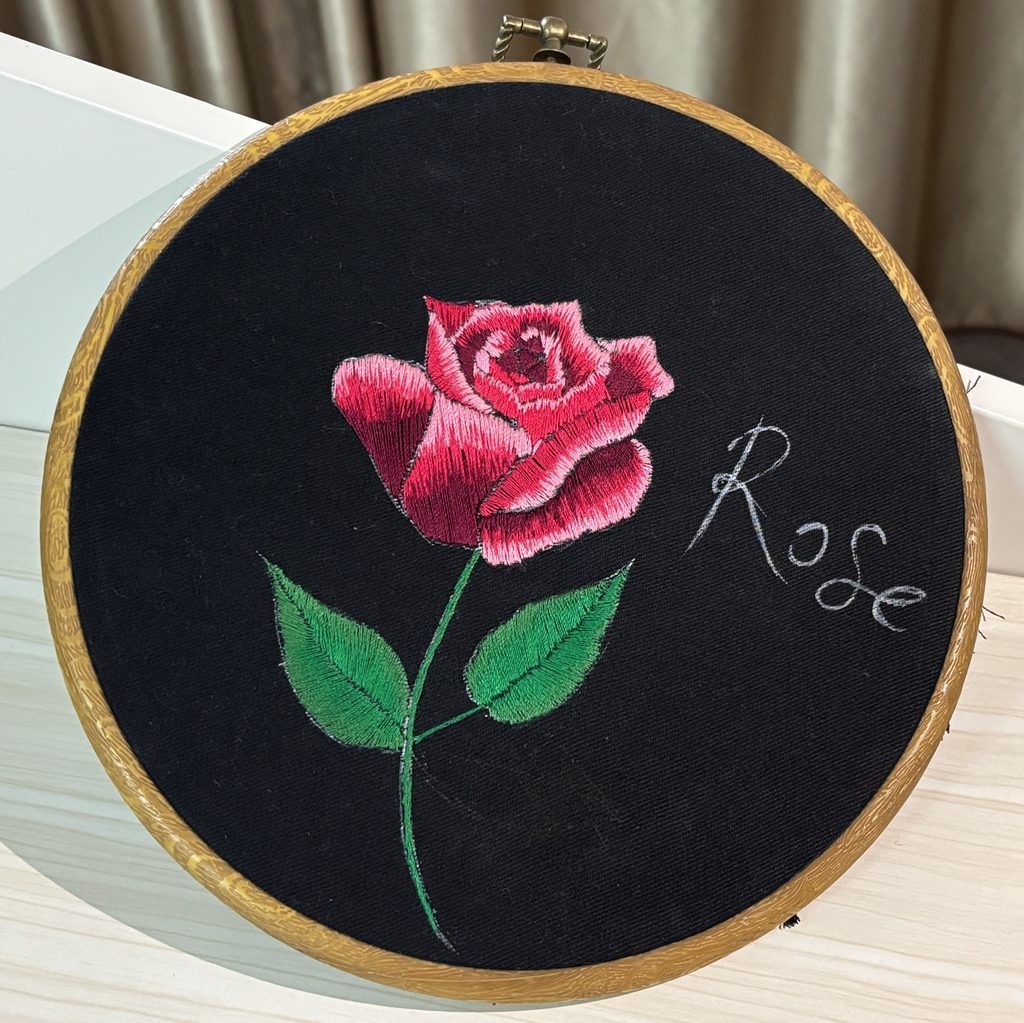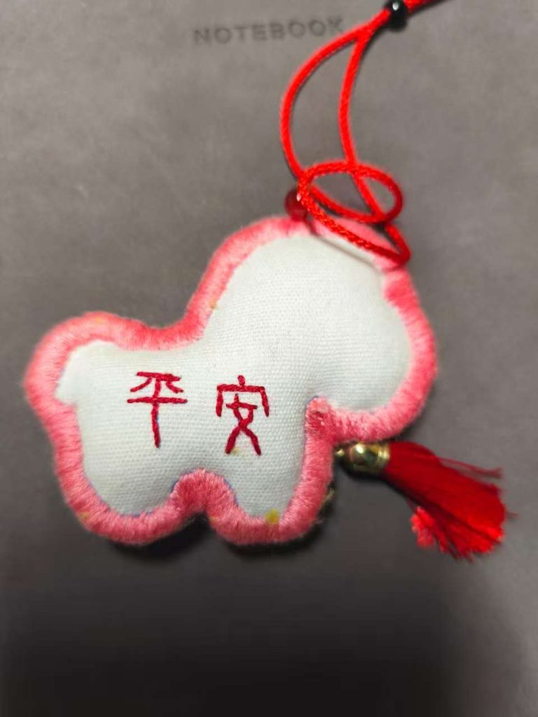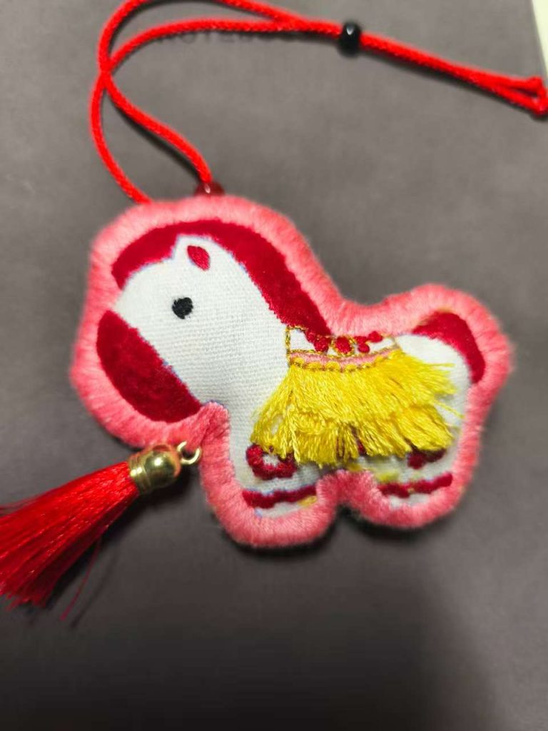 以棉麻布料为基底,采用彝族刺绣简洁灵动的平绣与锁边绣技法:平绣勾勒瑞兽轮廓与 “平安” 文字,用红、白配色凸显祈愿主题的鲜明性;锁边绣以粉色绣线包裹挂饰边缘,既强化了造型的圆润质感,也增添了柔和的装饰性;同时搭配红绳、流苏等配件,让挂饰兼具刺绣的手工温度与日常使用的便携性,色彩明快、工艺精巧,是彝族绣艺 “小而美” 的体现。