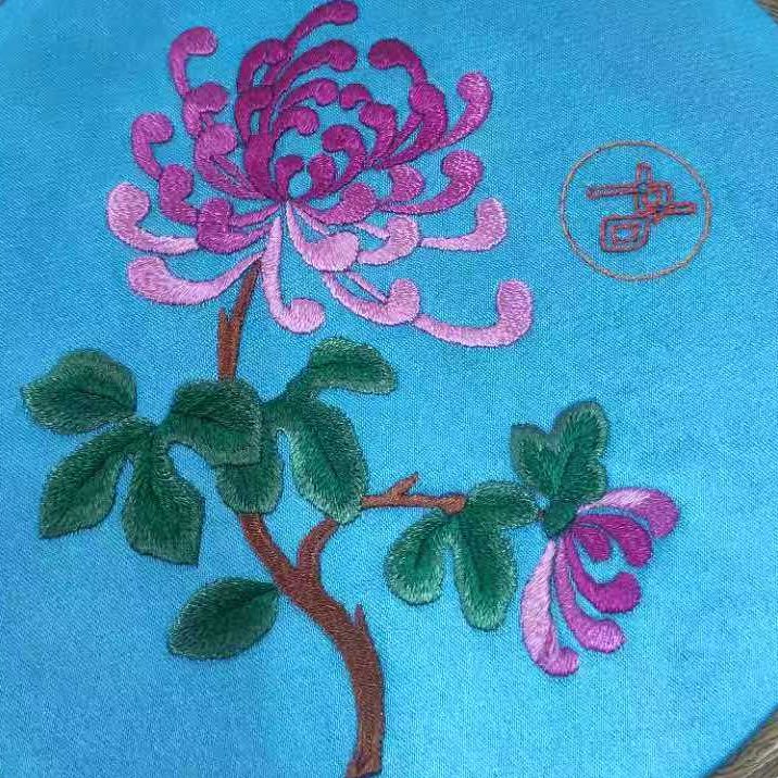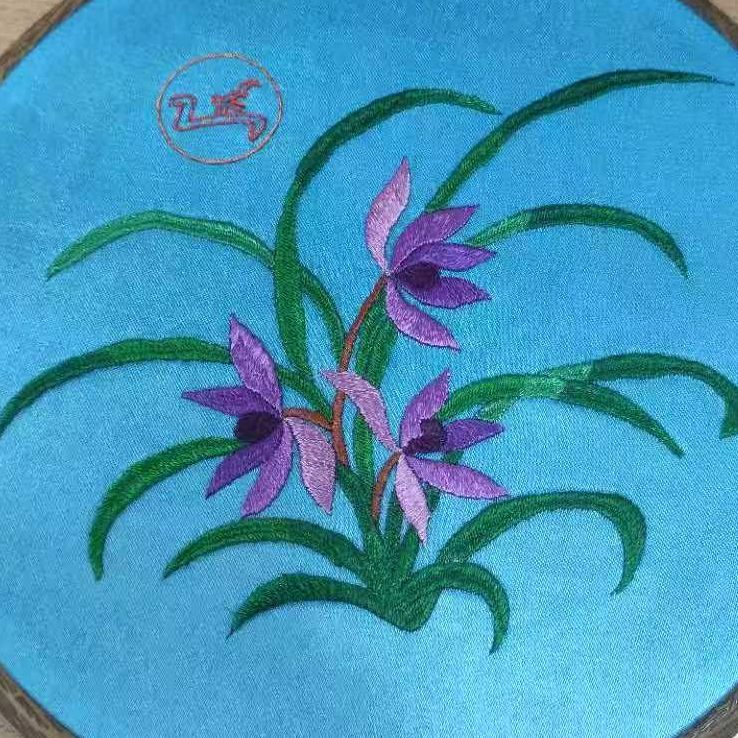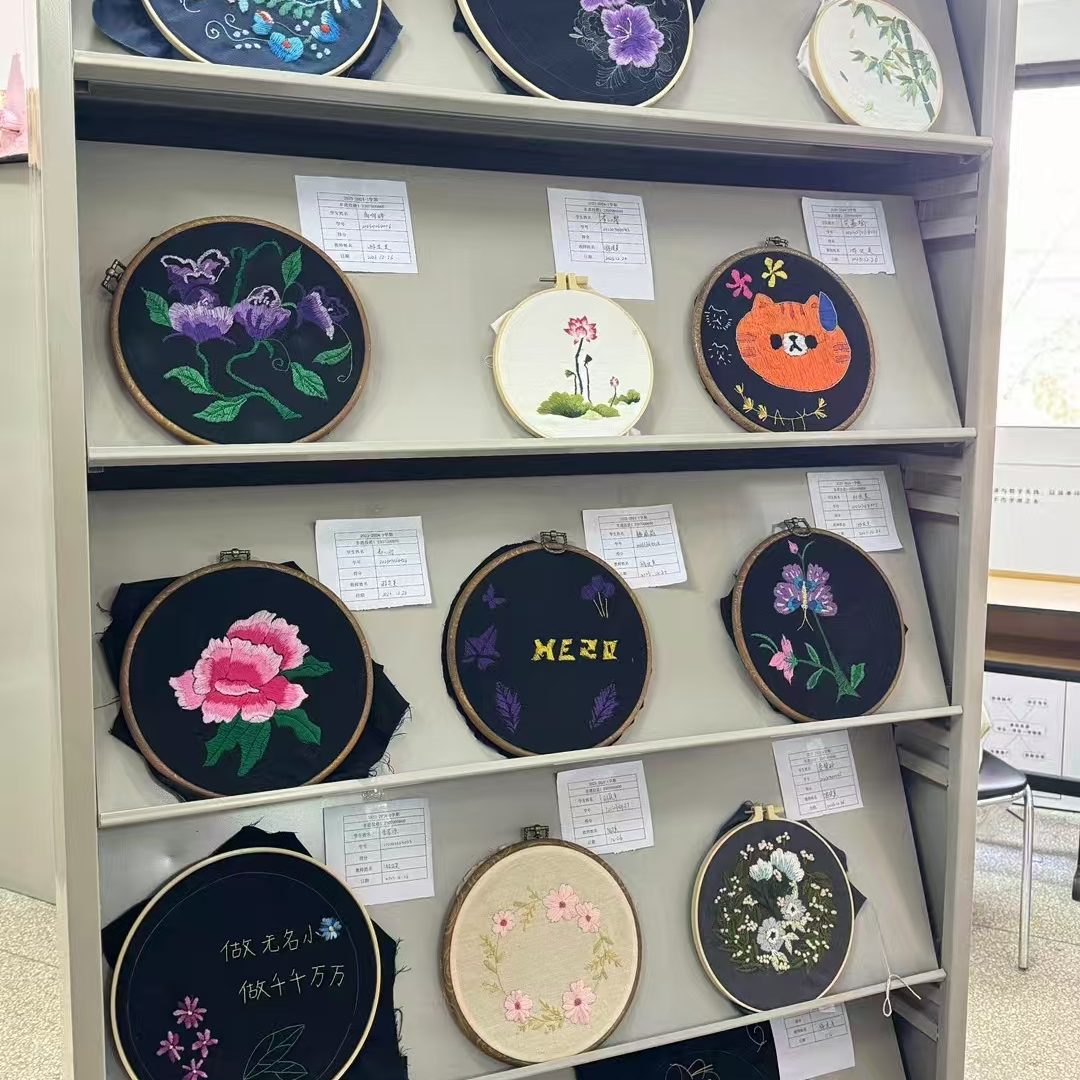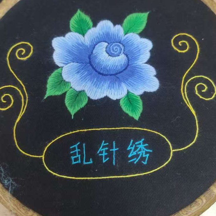 作品纹样承载着彝族的文化符号与生活期许:双凤是彝族文化中的 “吉祥神鸟”,象征 “和美合欢”,常见于彝族婚俗、节庆服饰,暗含对家庭和睦、族群团结的祈愿;蝴蝶对应彝族 “万物有灵” 的自然观,代表 “生机灵动”;中心花卉融合彝族常植的牡丹、蓝花楹元素,借 “繁花盛放” 寓意生活红火、福气绵延;蓝、绿等冷色调呼应云南山林风貌,黄、紫等暖色调凸显彝族 “以艳寄情” 的审美,色彩的交融也暗合彝族 “多元共生” 的文化特质。这幅绣品既是彝族绣娘指尖的技艺结晶,也是彝族文化 “以绣载情、以纹传意” 的生动体现,每一处针线都凝结着对美好生活的向往。