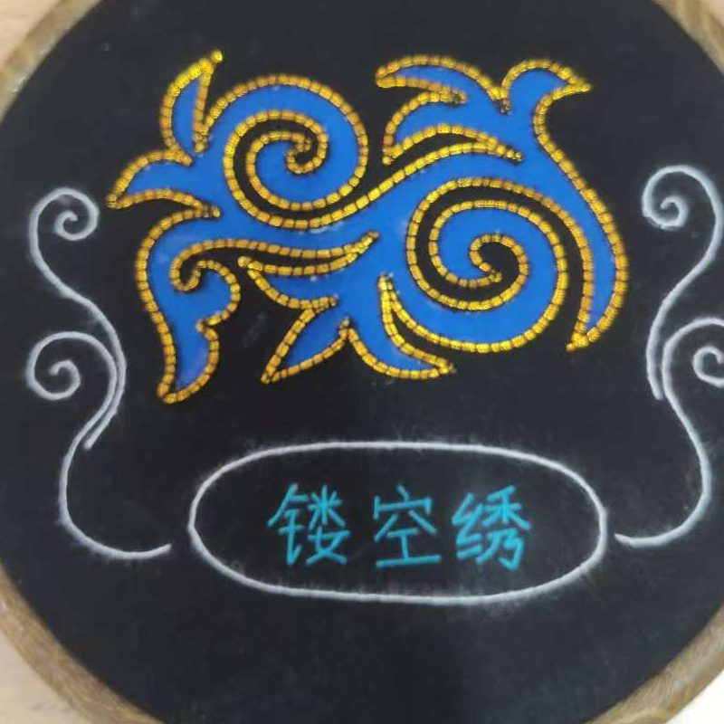 以白色棉布为基底,运用彝族刺绣经典的平绣、打籽绣与辫绣技法:平绣铺陈龙凤躯体、花卉花瓣的色彩,通过红、蓝、金等浓艳丝线的层次叠加,还原物象的饱满质感;打籽绣点缀龙鳞、凤羽与花蕊,以细密线结增强纹样的立体精致度;辫绣勾勒龙凤轮廓、水波线条,针脚紧实流畅,让动态物象更显灵动生动。同时采用中心对称式构图,宝器居于核心,龙凤、花卉对称分布,既保留彝族刺绣的规整仪式感,又通过物象的动态姿态(龙凤舒展、锦鲤游动)让作品兼具庄重与鲜活。