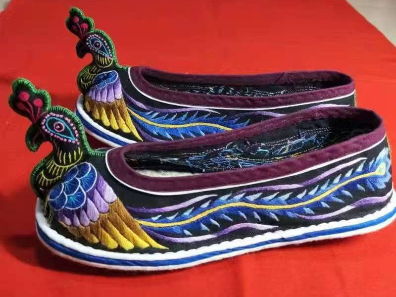 彝绣作品4——《雀翎踏云》彝族孔雀纹绣鞋