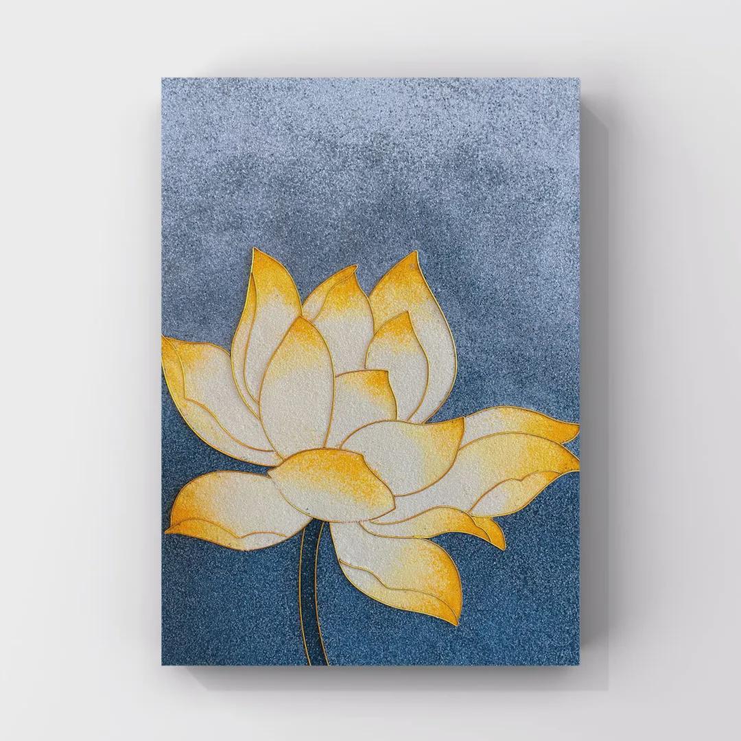 以云南本土荷花为核心意象,是掐丝珐琅彩画在“极简美学”领域的探索。作品以蓝灰渐变底板为背景,荷花以白、黄釉料为主调,线条简洁却质感饱满,既保留了珐琅彩的莹润光泽,又以简约构图适配现代简约风格的装饰需求。