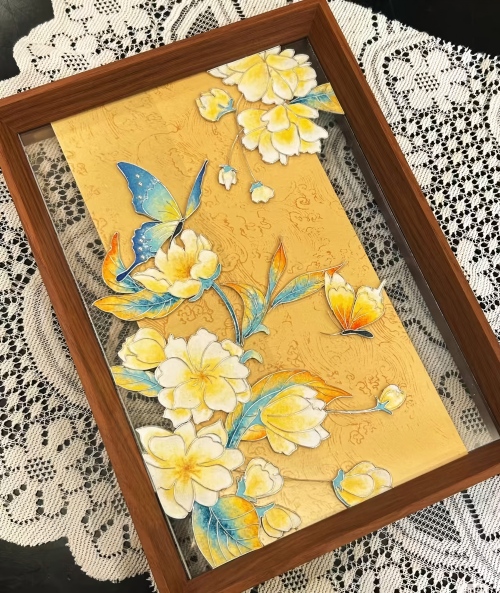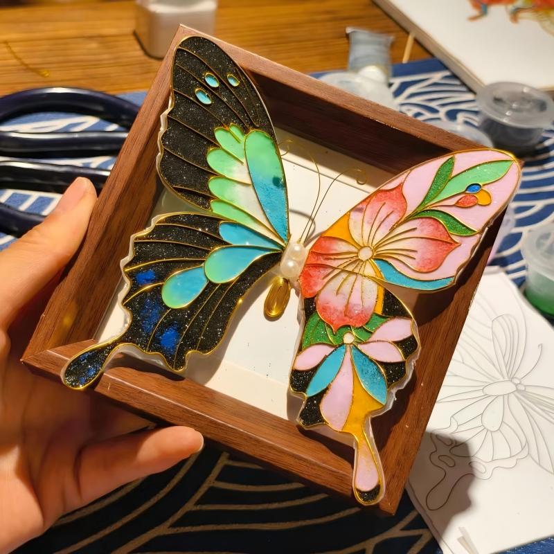 采用“铜丝弯折塑形+分层点蓝”技法:蝴蝶的翅膀以铜丝掐出立体弧度,花卉的花瓣通过层叠铜丝呈现浮雕质感;釉料选用细腻的沙质釉,蝴蝶翅膀叠加闪金釉点缀,花卉部分以黄、白、蓝等清新色调呼应云南春日花海,木质画框衬托出作品的温润气质,适配现代家居的装饰场景。
