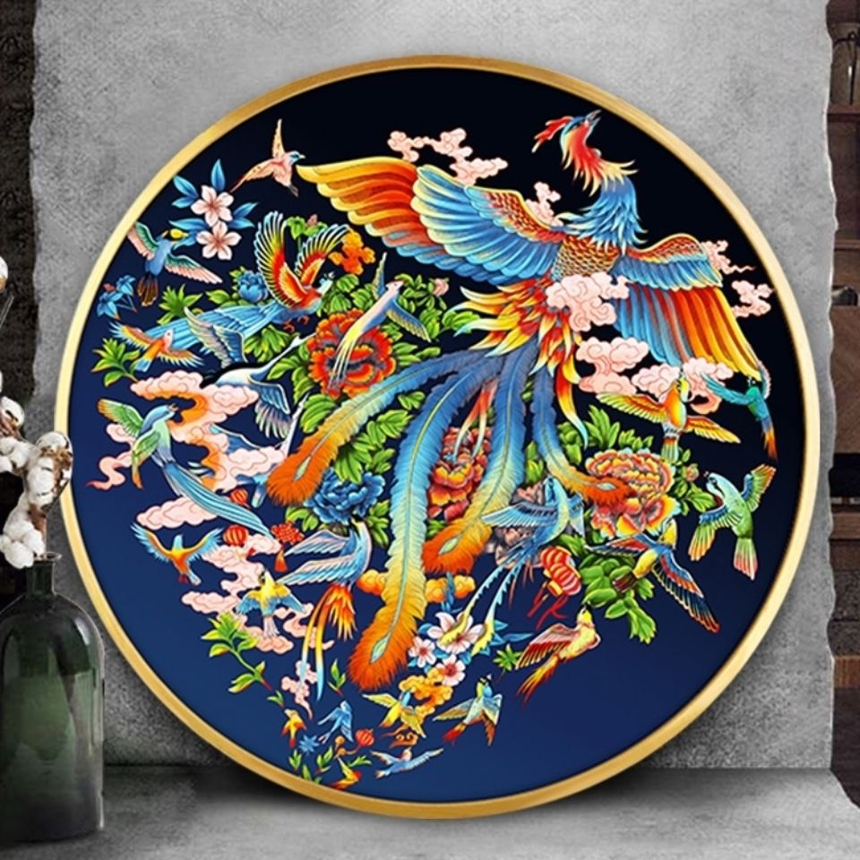 以圆形深色底板为基底,采用“粗铜丝构框架+细铜丝描细节”的掐丝技法:凤凰的躯体以粗铜丝定型,羽纹、花瓣脉络则用细铜丝勾勒,层次分明;釉料选用矿物质感的亮色调,凤凰羽翼叠加金釉提亮,花卉部分以渐变色点蓝还原自然色泽,深色底板衬托出色彩的明艳张力,尽显珐琅彩“绚丽饱满”的特质。