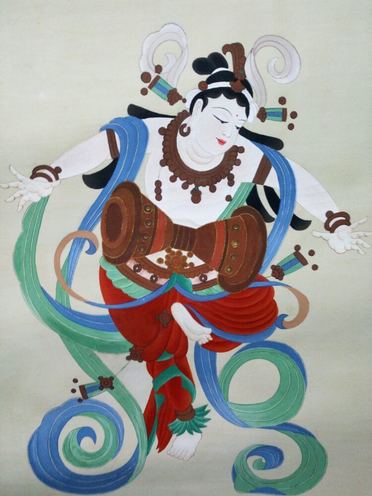 这幅作品以敦煌飞天为原型,融入云南少数民族服饰元素,是“经典意象+滇地风格”的创新创作。飞天的飘带以云南扎染的蓝绿渐变配色呈现,配饰点缀彝族银饰纹样,既延续了传统飞天“飘逸灵动”的美学特质,又暗含云南多民族文化的装饰风格。