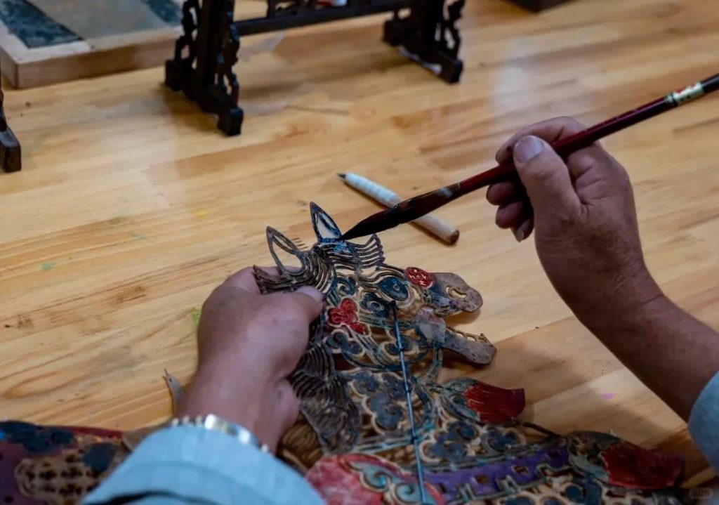 工艺上,作品延续了云南皮影的核心技法:人偶以黄牛皮为原料,经刮薄、雕刻、植物染色等工序制成,衣袍的镂空细节(如武生裙摆的花纹)既保证了透光性,又让光影投射在幕布上时层次分明;操纵时,艺人通过签子控制人偶的肢体动作,连马匹的头部摆动、角色的持械姿态都能灵活呈现,这正是云南皮影 “以影传神” 的魅力所在。