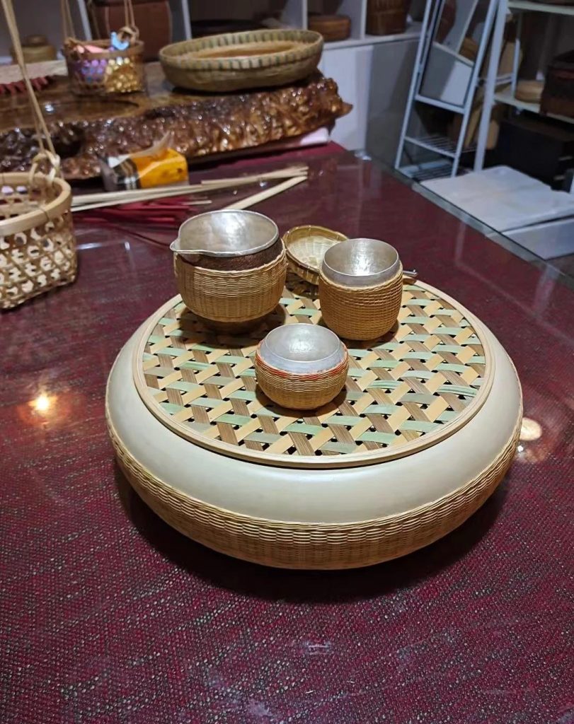 以 “竹韵茶事” 为核心,将云南传统竹编技艺与中式茶器功能结合,是竹编技艺 “生活化美学” 的创新作品。这套茶器以茶盘、公道杯、品茗杯等组件构成完整茶席,既延续了云南 “竹器伴茶” 的民俗传统,又适配现代茶生活的仪式感需求,让非遗竹编成为茶事场景中兼具实用与美学的文化载体。