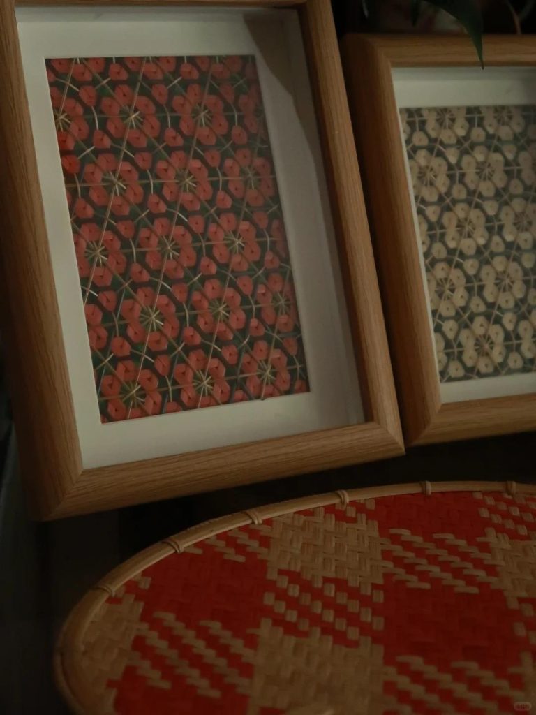 该作品以云南慈竹篾丝为原料,分原色与草木染双色(红色 / 米色)两类篾丝,采用 “经纬锁纹编” 技法:以深色竹篾为底经,双色篾丝为纬,通过精准控制篾丝穿插顺序与间距,织就规整的六角星几何纹样;经手工固定于画框内,兼具竹编的肌理质感与装饰画的平面美学;同时搭配原木画框,强化自然质朴的风格适配性。
