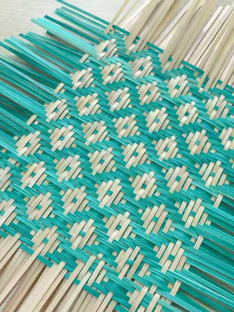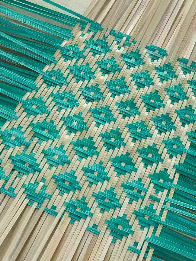 该作品以云南慈竹篾丝为原料,分 “原色竹篾” 与 “草木染青竹篾” 两类(原色竹篾经蒸煮晾晒保天然质感,青色竹篾以板蓝根等天然染料染色),采用 “经纬穿插编” 中的 “菱形锁纹” 技法,织就规整的双色菱形纹样,后续可加工为竹席、竹垫等器物,既体现竹编 “分毫间见匠心” 的技艺精度,也以双色搭配实现传统工艺与现代审美的融合。