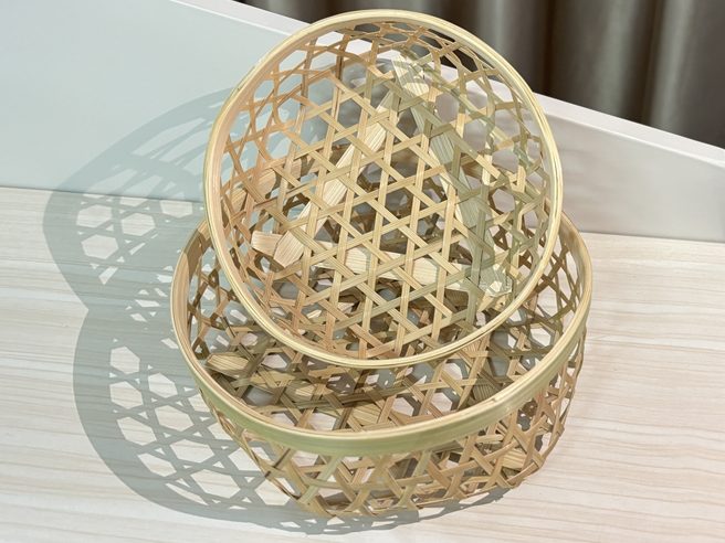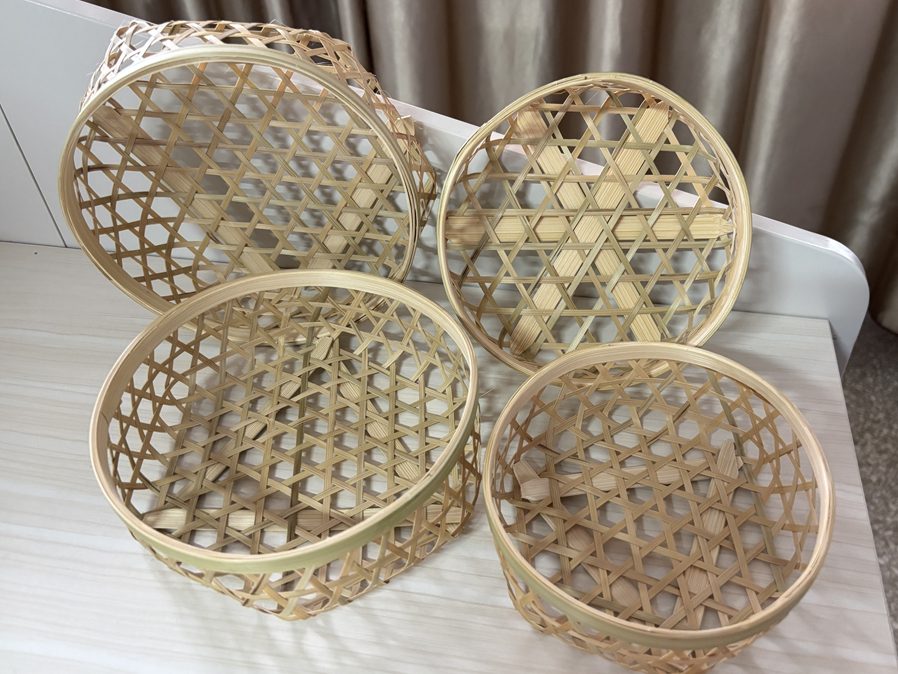 以宜良本地楠竹为原料,采用宜良竹编标志性的 “六角经纬编” 技法:经篾与纬篾以 60 度夹角交织,形成规整的六角镂空纹理,每根竹篾经 “三蒸三晾”(蒸煮去糖防虫、晾晒增韧定形)处理,直径仅 0.4 毫米,全靠竹篾张力无钉无胶成型;篮沿以加厚竹圈收边,4 个尺寸梯度适配不同收纳需求,具有结构稳定性,是宜良竹编 “细而坚” 的工艺缩影。